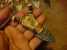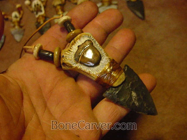 Here I carved a little acorn from antler and on the front of the arrowhead necklace, the arrowhead was made by Gary reed AKA grasshopper, signed bonecarver and numbered..this one is SOLD.. ORDERS WELCOME
