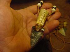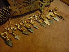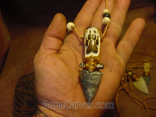 A beautiful carved antler arrowhead necklace where I carved a wolf track on the front , the arrow head was made by Gary reed AKA grasshopper , the necklace is signed bonecarver and numbered.