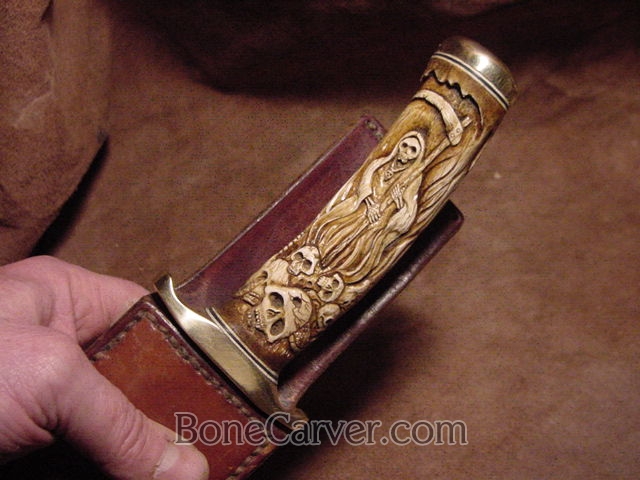 Grim Reaper THE GALLOWS carved antler bowie knife
