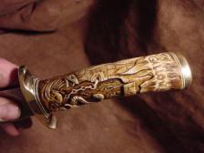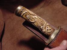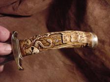 A amazing detailed carved antler handle with the grim reaper and plenty of skulls, snakes even a rat.. the knife is carbon steel ..commissioned, Sold