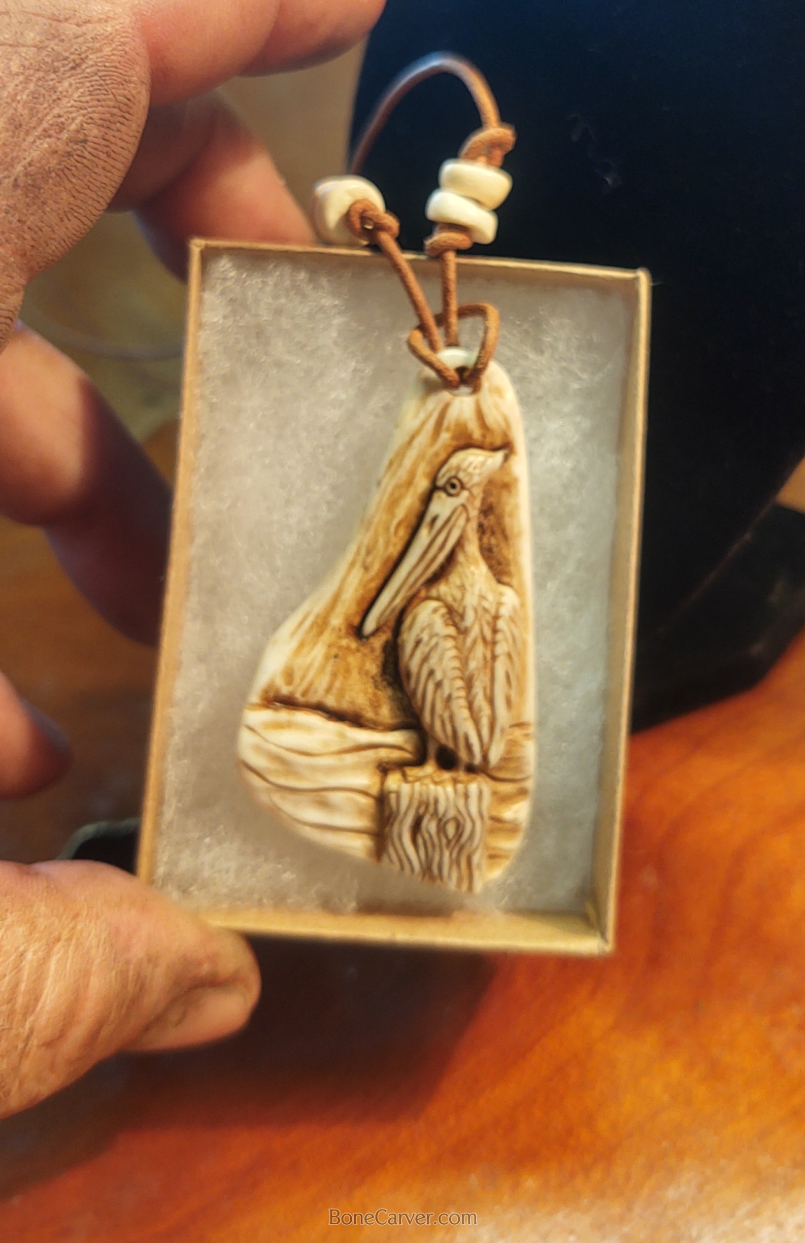 Here is a very cool carving of a friend of mine I met in key West Goliath the pelican !! He wanted to eat ever fish I caught .. so I fed him them , he was happy . I carved him on a slice of antler and made into a necklace , it is ready to wear as soon as you open your package . Signed Bonecarver and numbered.