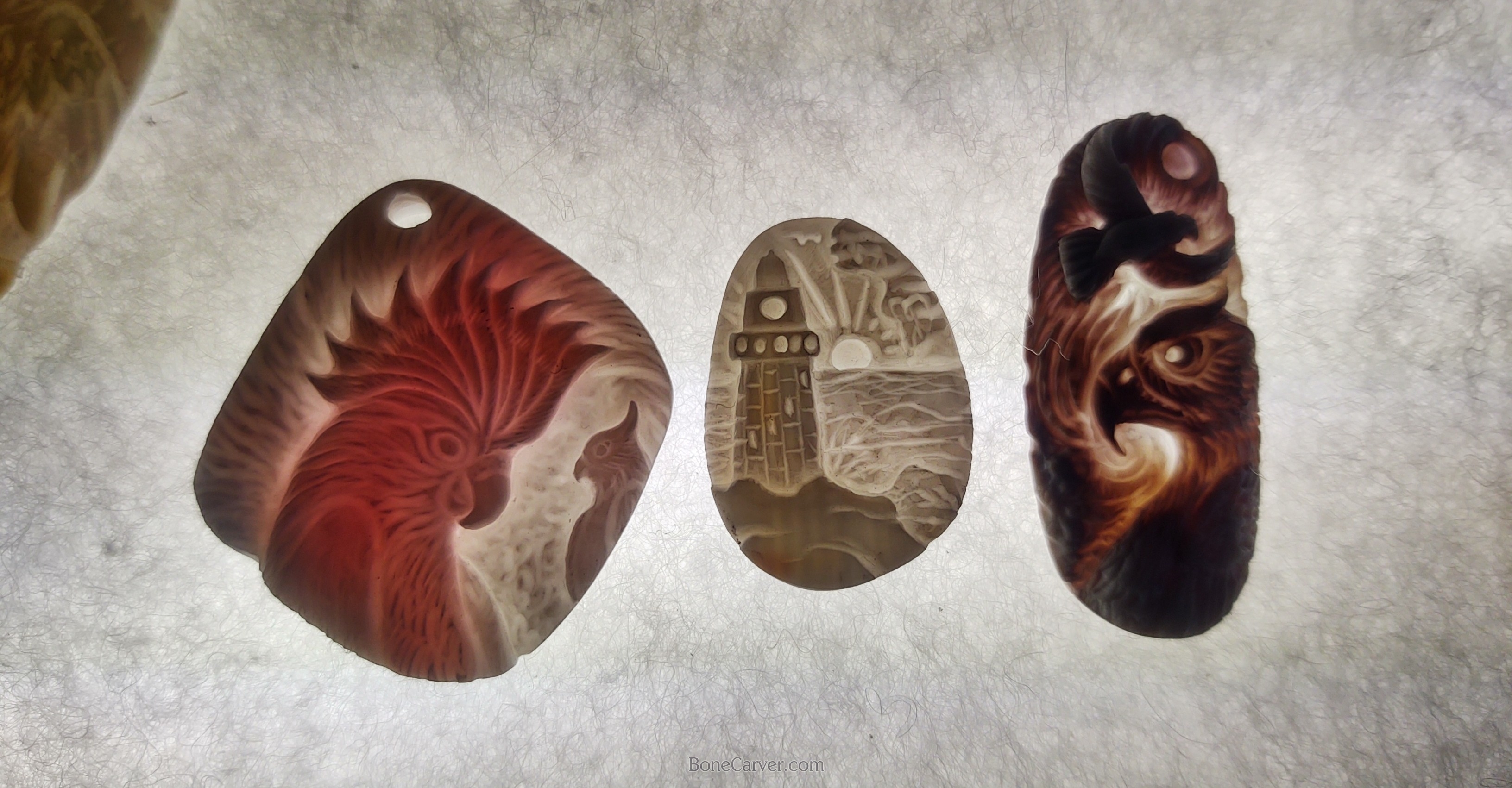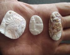 Here are several different shell carvings that I have done and that are available please email boneCarverjack@gmail or text message