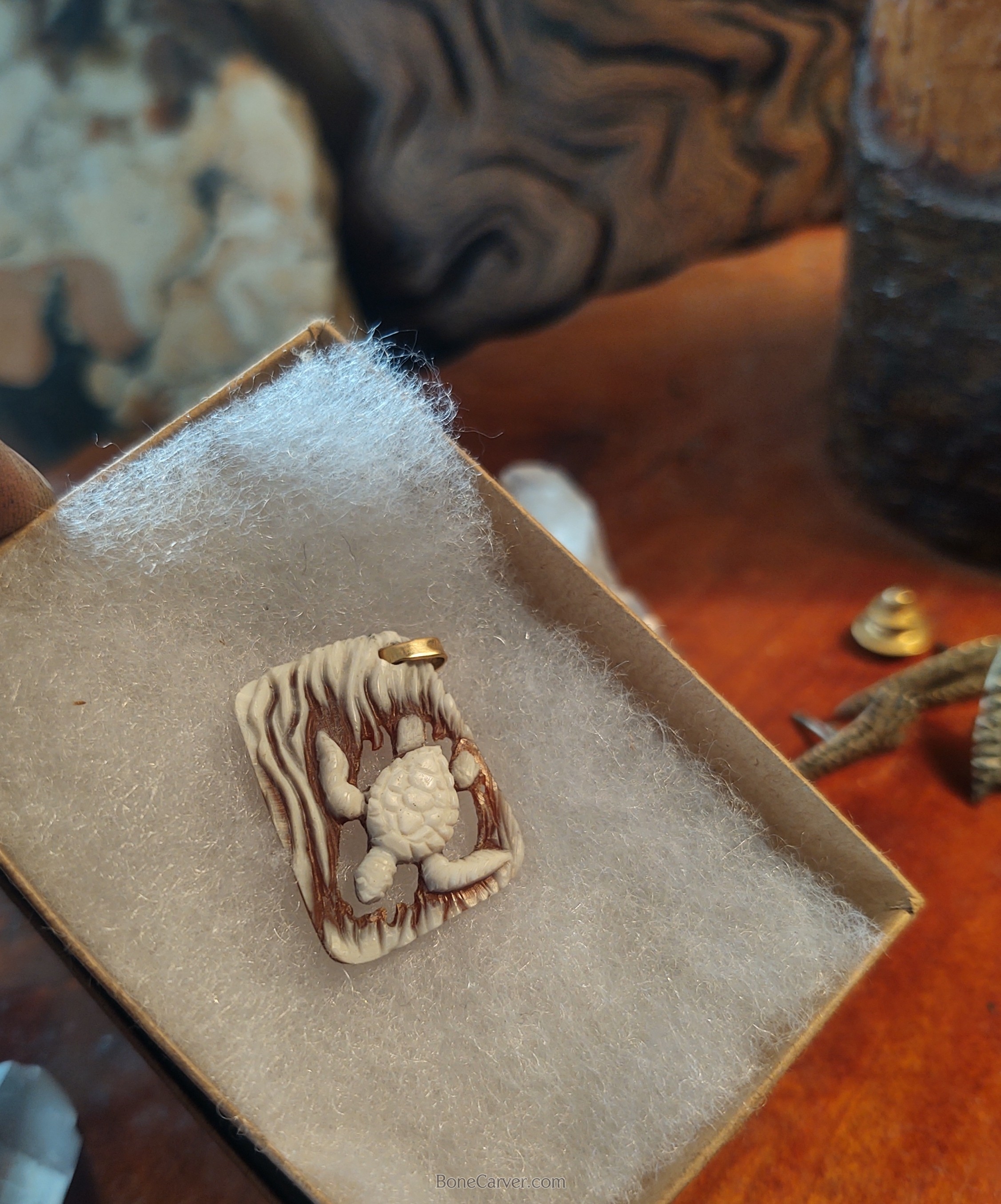 Here's another shell Cameo where I carved a small sea turtle swimming I drilled a small hole and included a 14 karat gold Bale it is signed bone Carver and numbered