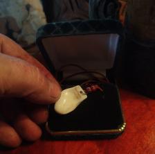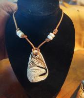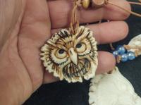 Here is as a very detailed elk scene carved Ina genuine elk ivory tooth. , Polished like glass and composed Into a necklace as a small hole was drilled and a Sterling silver jump ring and brown leather cord with sum beads are included, it is ready to wear as soon as you open your package .. other carved elk teeth are available and I also take commission if you wish to have your own elks teeth Carved . .. signed Bonecarver and numbered.