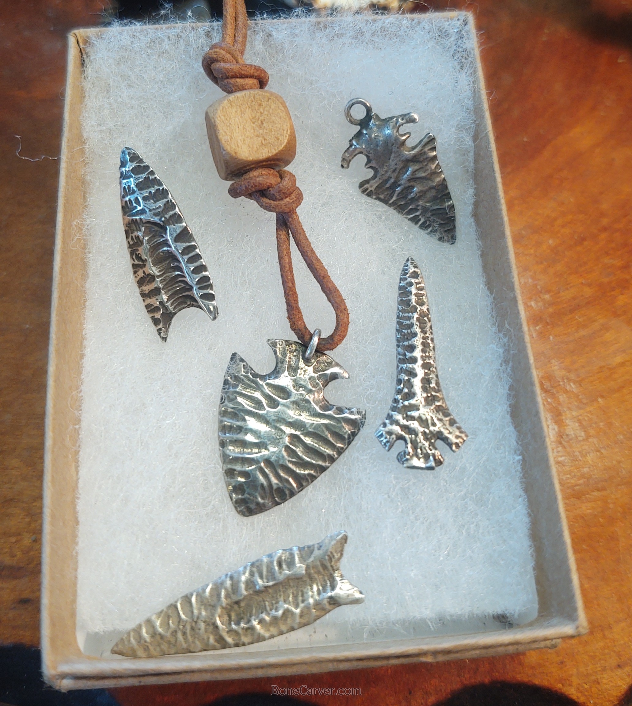 This listing is for one Arrowhead necklace made from sterling silver these are extremely limited and not too many of each made these ones are composed as a necklace and there's five choices Snyder, Clovis, Cumberland, Age, E-knotch. a adjustable brown leather cord and beads are included. Please let me know what type you wish with payment . Price is each.
