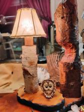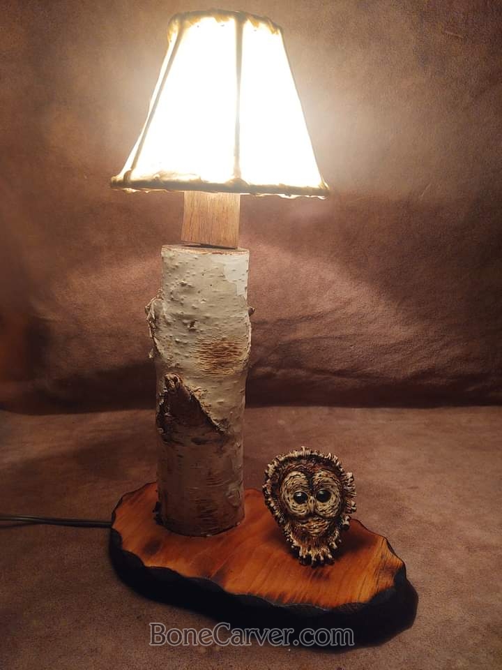 Here's a very beautiful night light or desk lamp where I carved a barred owl face on the front of a elk antler crown and mounted it on the lamp base the pole of the lamp is white birch up to the candelabra light bulb the shade is genuine rawhide and heavy construction felt pads are mounted to protect your table or desk one of a kind signed a boneCarver and numbered