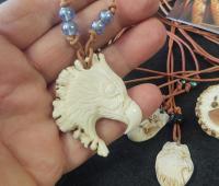 Here's a very beautiful carved antler eagle necklace with st... |